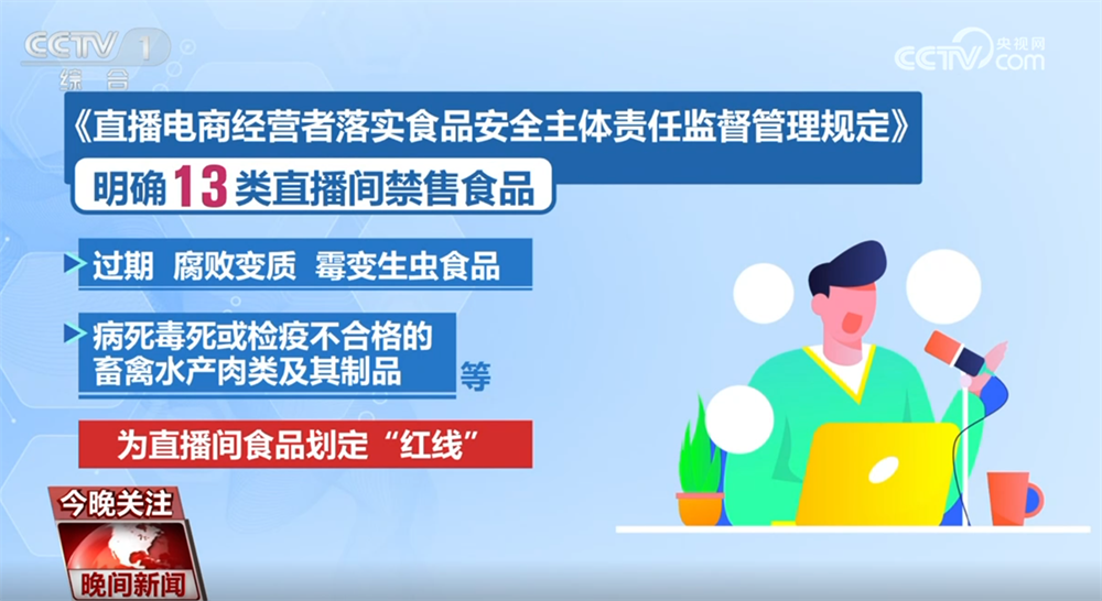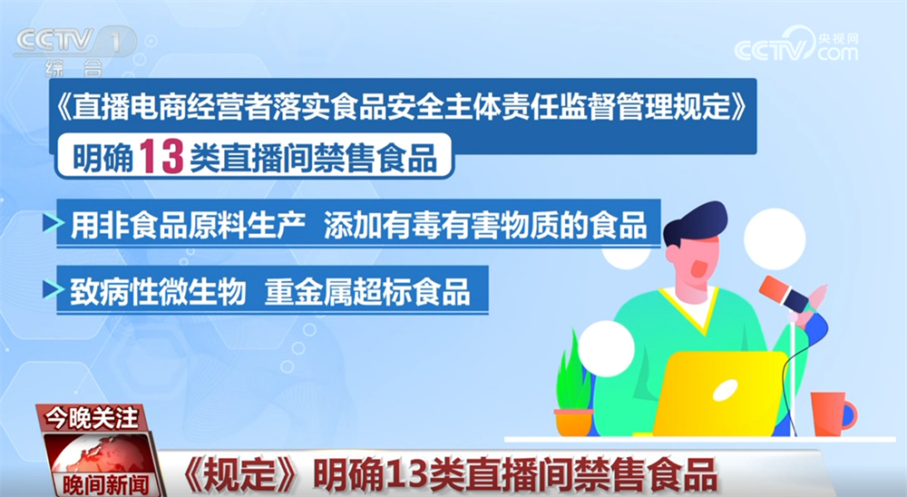 《》明白13类曲播间禁售食物,包罗用非食物原料出产、添加有毒无害物质的食物;致病性微生物、沉金属超标食物;过时、变质、霉变生虫食物;病死毒死或检疫不及格的畜禽水产肉类及其成品等,为曲播间食物规定“红线”。