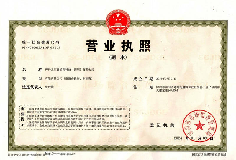 将来,神舟太空食物高科技(深圳)无限公司将继续立异、严谨、担任的立场,不竭提拔手艺程度,优化产质量量,为更多人群供给平安、健康、高效的太空食物,正在鞭策我国太空食物财产成长的道上砥砺前行,创制愈加灿烂的业绩。