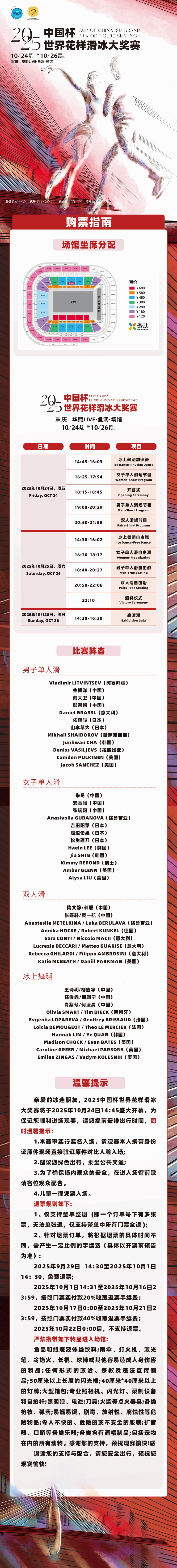 9月29日,2025中国杯世界花腔溜冰大赛正在巴南区举行碰头会,现场不只揭晓了赛事焦点赛程取参赛阵容,还正式启动票务预售。10月24日至26日,沉庆华熙LIVE・鱼洞·场馆将送来全球60位顶尖花滑选手,为不雅众呈现“竞技取艺术交融、冰取火碰撞”的出色赛事。中国杯世界花腔溜冰大赛是由国际溜冰联盟(ISU)从办的国际赛事,做为世界花腔溜冰大赛六个分坐赛之一,自2003年落户中国以来,已正在、上海等多地举办了19届,本年也是中国杯第五次落地沉庆。2025年中国杯吸引了来自14个国度的60名活动员参赛,米兰冬奥赛季的大幕曾经,本次赛事做为奥运赛季花滑国际赛事的环节一坐,是查验全球顶尖选手竞技形态的主要平台。碰头会上,中国花腔溜冰协会任洪国正在致辞中暗示,中国杯已成为展现中国花滑、鞭策冰雪活动普及的主要平台,沉庆做为西南冰雪活动先行者,五次承办中国杯是“南展西扩东进”计谋的活泼实践,等候本次赛事让更多人爱上花滑这项充满魅力的活动。体育局党组、副局长张周怯强调,中国杯是沉庆“体育强市”扶植的主要支点。赛事不只是全球选手的竞技场,更将鞭策冰雪活动从“活动项目”升级为“提拔市平易近糊口质量的载体”。巴南区人平易近党组、副区长李萍引见了目前的赛事筹备环境,许诺将从住宿保障、食物平安保障、交通平安保障、医疗保障等方面全力做好赛事保障,并向全球冰雪快乐喜爱者发出邀请。中国花腔溜冰男单活动员金博洋、女单活动员张瑞阳,及冰舞组合王诗玥/柳鑫宇出席了碰头会。金博洋暗示,沉庆的热情空气取熟悉的赛场让他倍感亲热,同时透露本赛季的节目中藏有细心设想的细节。刚升入成年组的张瑞阳暗示,本赛季拿下亚洲公开赛冠军让她收成满满决心,此次中国杯她但愿能进一步冲破。王柳同伴对再次回到中国杯暗示等候,并但愿能通过演绎取以往分歧气概的节目让大师耳目一新。本次赛事正在赛程方面节拍紧凑且亮点分明:10月24日(周五)冰舞韵律舞、女单/男单/双人滑短节目;10月25日(周六)进行各项目滑/舞的比赛,决出最终牌归属;10月26日(周日)的表演滑则将空气推向——选手们将抛开竞技压力,用个性演绎为冰迷献上“沉浸式艺术秀”。赛事门票价钱区间设置为120元-680元,目前已预售,不雅众可通过秀动、猫眼、看个角逐、票星球、久事体育等多收集平台进行购票。做为国际滑联赛事,2025中国杯的参赛阵容可谓众星云集,既有奥运冠军、世锦赛冠军,也有中国重生代力量,他们将别离合作男单、女单、双人、冰舞四个项目标牌。(任峰)