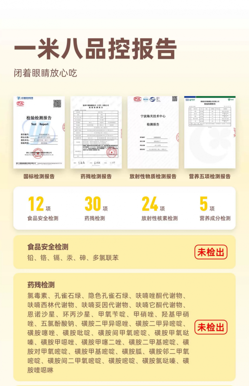 除了配料表的通明化,一米八海洋科技还从海域到餐桌,全面实现了消息的可视化。他们每季度发布的品控演讲,如统一次公开的“云监工”,让消费者可以或许及时领会产物的出产过程取质量节制。检测演讲涵盖了沉金属、农残、污染物等71项目标,每一项数据都严酷对标国际高端尺度,确保产物的平安取质量。